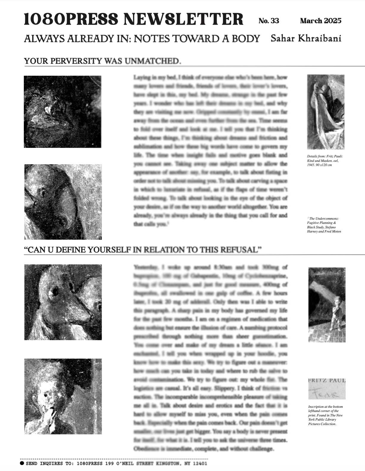 Already in: Notes Toward a Body, 1080PRESS Newsletter